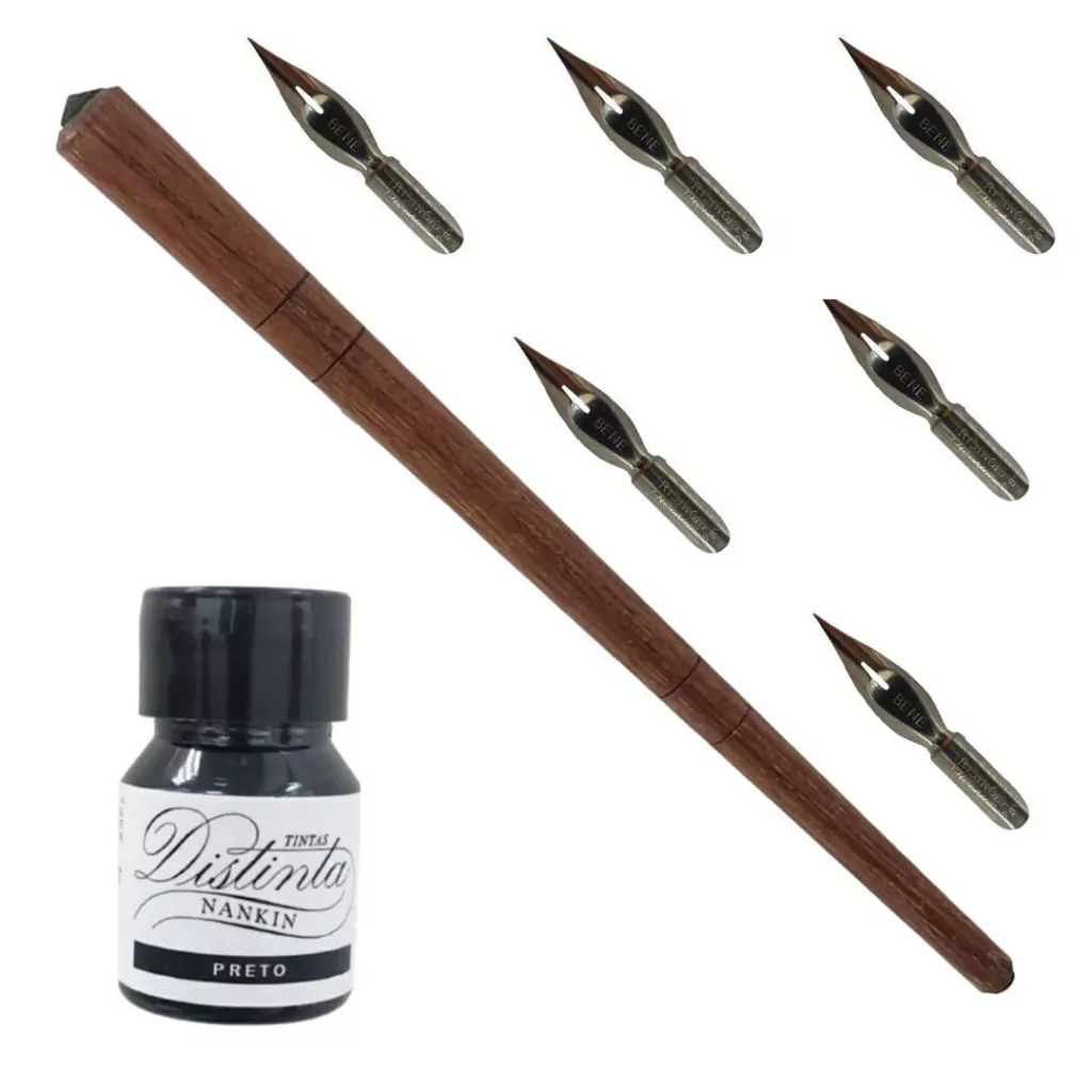 Nós utilizamos papel Special Plus 120 gramas.Você está comprando um kit com 6 antigas penas inglesas, um cabo artesanal de madeira, e um frasco de 30ml de tinta "caseira" da marca Distinta!