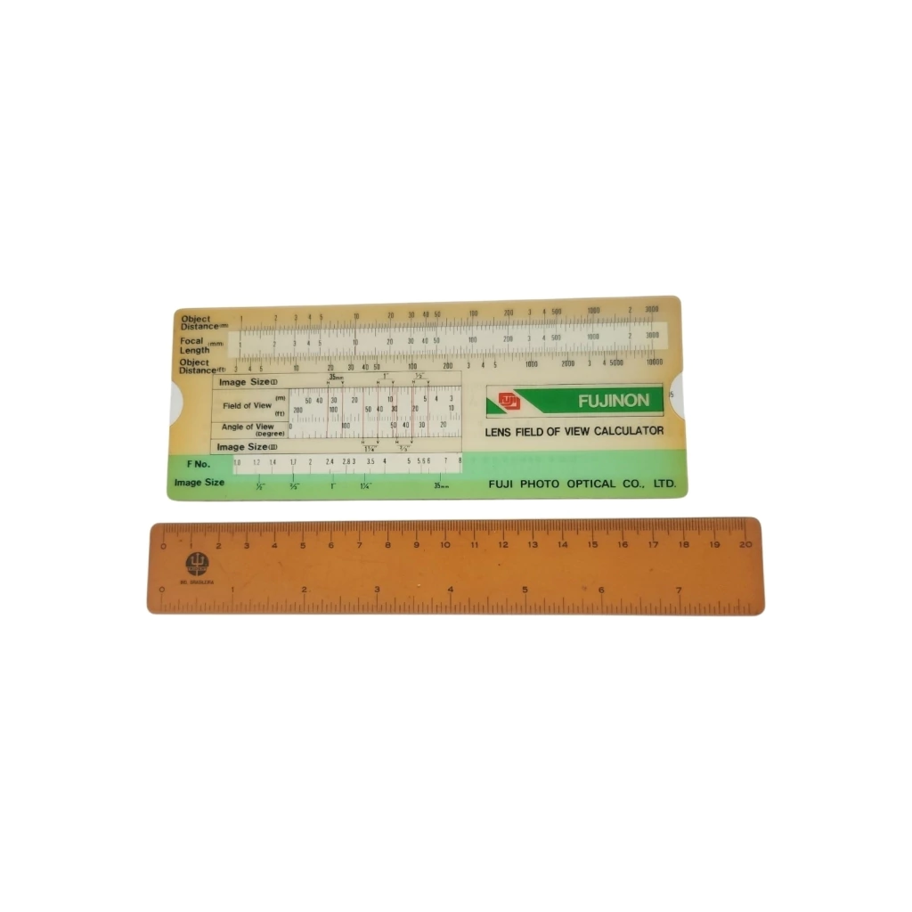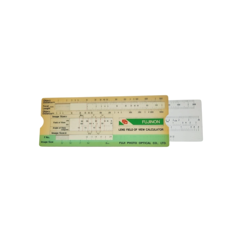 A antiga calculadora de campo de visão de lentes FUJI era uma ferramenta utilizada por fotógrafos e cineastas para calcular o campo de visão de uma lente em relação ao tamanho do sensor ou filme. Esse tipo de dispositivo era bastante útil, antes da popularização das calculadoras digitais e dos aplicativos de smartphone.