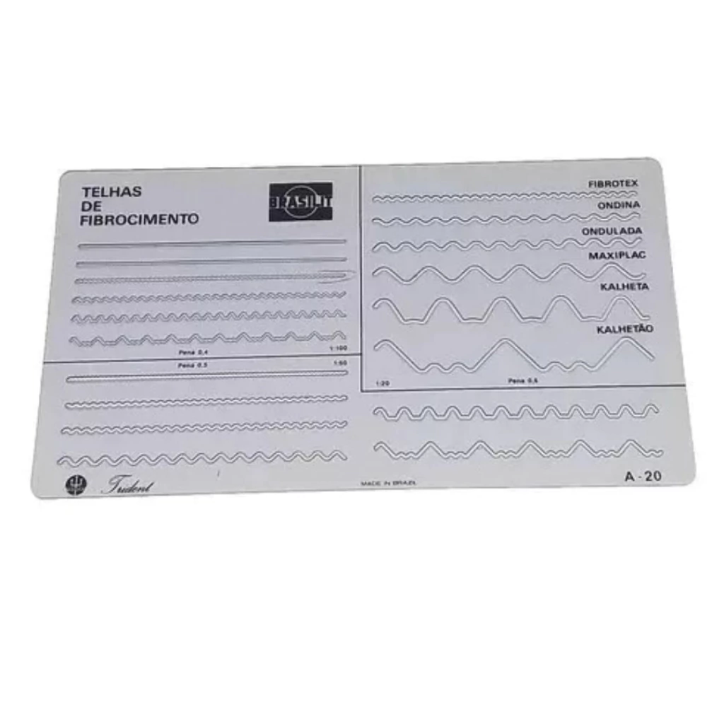 O Gabarito de Arquitetura Modelo A-20 da Trident é uma ferramenta projetada para auxiliar profissionais e estudantes na elaboração de projetos que envolvem perfis de coberturas de fibrocimento, especificamente os modelos fabricados pela Brasilit. Este gabarito apresenta perfis em três escalas: 1:20, 1:50 e 1:100, permitindo a adaptação a diferentes necessidades de projeto. Com dimensões de 23 cm de comprimento por 13 cm de largura, é fabricado em material de excelente transparência e durabilidade. Os vazados possuem um degrau que impede borrões durante o desenho, garantindo traços limpos e precisos. Ideal para uso com canetas técnicas, lápis ou lapiseiras, este gabarito é indispensável para a criação detalhada de plantas e layouts que incluem sistemas de cobertura.