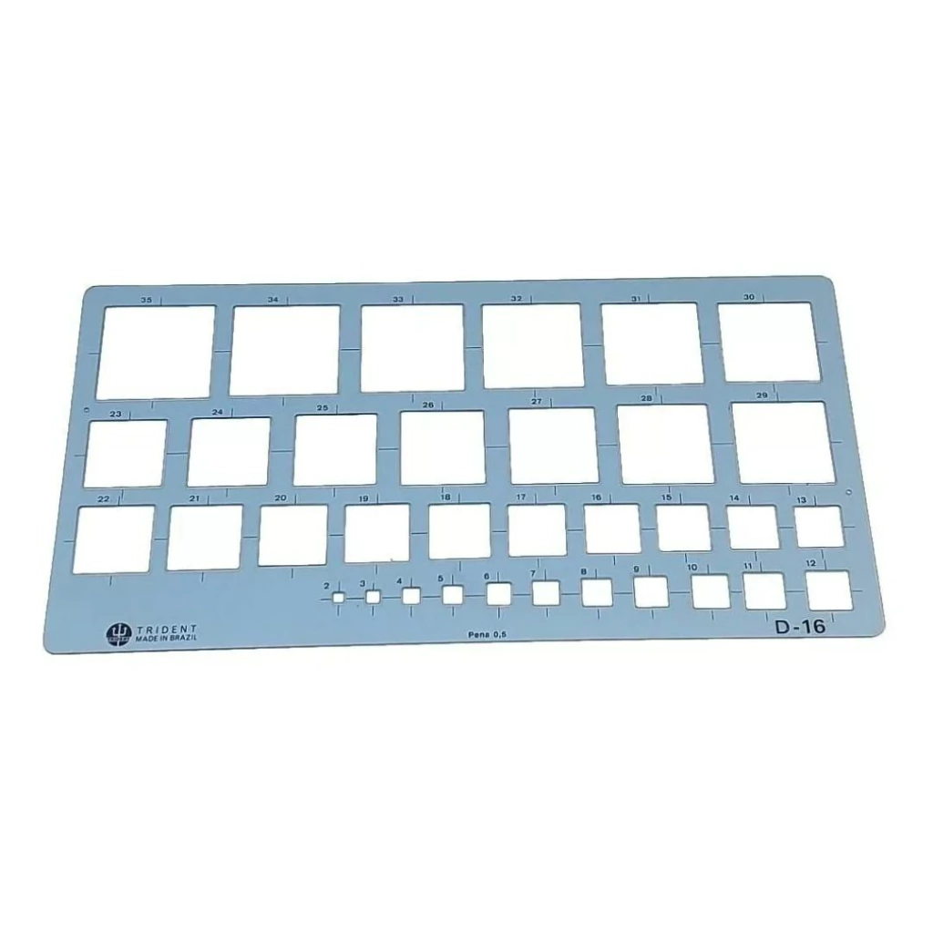 O Gabarito Trident D-16 é uma ferramenta de desenho técnico projetada para auxiliar na criação precisa de quadrados. Fabricado em acrílico azulado com espessura de 1 mm, possui gravação rebaixada que facilita o uso com tinta, evitando borrões. Este gabarito contém 34 quadrados, variando de 2 mm a 35 mm, todos com marcações centrais para um posicionamento exato. Suas dimensões são 25 x 13 cm.